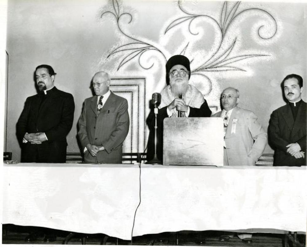 Black and white picture of five people standinf in front of a table with a white fablecloth. On either side of the picture, there is a man in a black coat and pastoral clothes with a white collar. They both have black collars. The next two men are wearing suits with white shirts and ties. They are also wearing glasses and have white hair. The one on the right has a white ribbon on his lapel. The man in the middle is standing in front of a podium. There is a microphone to the left. The man is wearing a black robe. He is wearing a black hat and glasses. There is a light colored shawl around his shoulders.