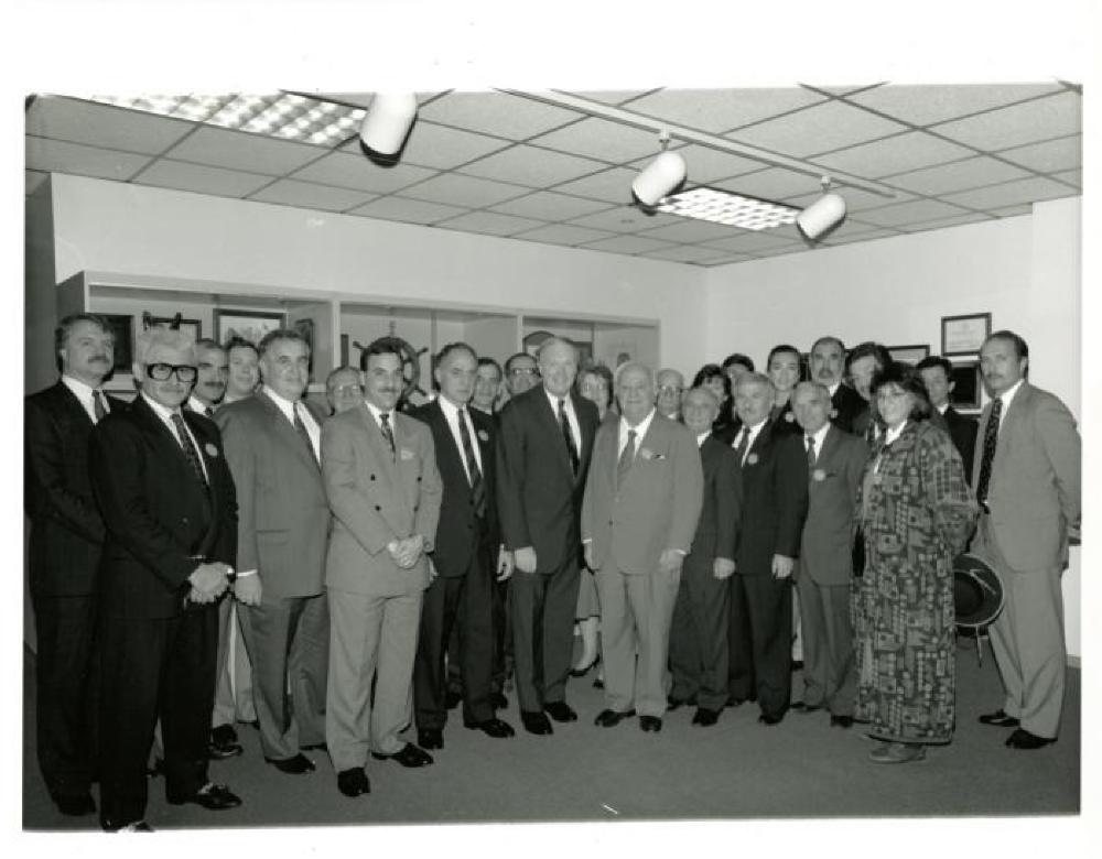 Picture was found in a frame with a piece of paper listing the Greek-American Community Services members. It is as follows: "Founders: John Psiharis, Elaine Thomopoulos, Ph.D.; Officers: President: Evangeline Mistaras; Vice-Presidents: Athanasia Papadopoulos, Pharm. D., Fotios Listas, PhD; Secretary: Peter Chioros, D.P.M.; Treasurer: Peter Maroutsos, CPA; Board of Directors: Michael J. Bakalis, Peter Chioros, D.P.M, Connie Gountanis-Rigas, Theodosis Kiotas, M.D., Elaine Kollintzas, Fotios Litsas, Ph.D., Peter Matoutsos, CPA, Evangeline Mistaras, Toni Panos, Athanasia Papadopoulos, Pharm.D., Aphrodite Sarelas; Executive Director: John Psiharis; Director, Community Aging Network: Ethel Kotssovos; Director, Cultural and Arts Program: John Rassogianis; Special Events Coordinator: Manolis Alpogianis."