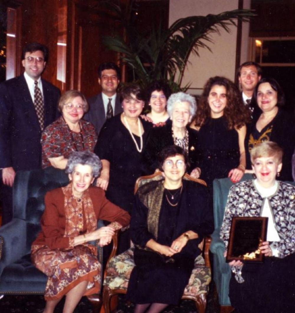 Greek Women's University Club officers display their Heritage Award presented during the Eighth Annual Greek-American Community Services Heritage Awards Dinner held on October 21, 1994 at the Ambassador West in Chicago. Pictured L-R: Seated: Presbytera Theano Rexinis, Barbara Javaras (GWUC president), Jean Leontios. Standing: Peter Maroutsos (GACS treasurer), Evangeline Mistaras (GACS president), Kostas Zografopoulos (GACS board member), Anna Moreno, Sandy Petropoulos, unknown, Athanasia Papadopoulos (GACS vice president and dinner chairman), John Psiharis (GACS co-founder and executive director) and Theodora Nicolandis.