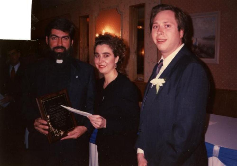 The Very Rev Nikitas Lulias (L) receives Greek-American Community Services Heritage Award from Athanasia Papadopoulos (dinner chairman and board member) and John Psiharis (GACS co-founder and executive director). This is during the Fourth Annual GACS Heritage Awards Dinner held on September 28, 1990 at Thirteen Colonies Banquets in River Grove. The theme of the dinner was "Greek-American Leadership in the 90s."