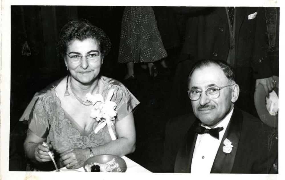 Black and white photo of wto people sitting at a table. The woman is wearing a harinet and glasses with a pearl necklace and a white corsage. Her dress is lacey on the front and sleek at the sleeves and back. In this black and white photo, it appears to be grey. She is holding an eating utinsel in her right hand, and has her left arm resting on the table. There is a bowl in front of her. The man is also wearing glasses. He is wearing a black suit with a white shirt and a black bowtie. He has a white flower in his lapel. A man holding a hat and the legs of a woman in a skirt can be seen in the background. The back has the number 550218 in blue.