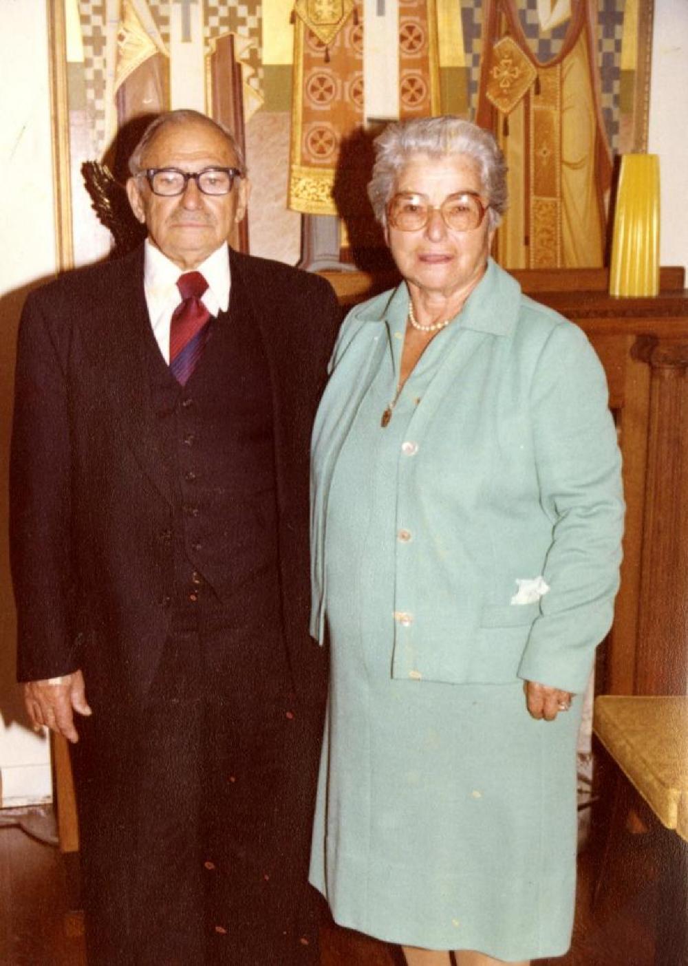 Color photograph of two people standing in a church. Murals of religious people can be seen in the background. There is a man on the left wearing a black suit with a black vest, a white shirt, and a red ang blue tie. He is also wearing glasses. The woman on the right is wearing a light blue dress with a light blue jacket. She also has glasses. She is wearing a white pearl necklace.