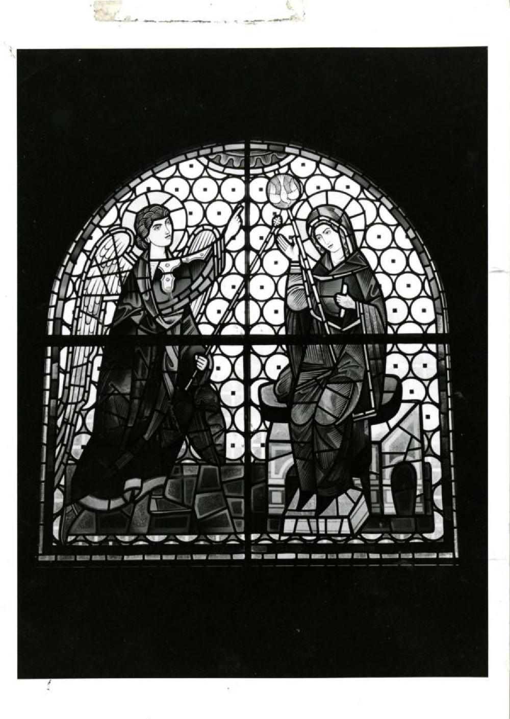 Black and white photo of a stained glass window. On the left, there is an angel with wings wearing a robe and holding a staff in his left hand. On the right, there is a woman holding a scroll in her left hand with a dove above her head. Both people have halos. the background is composed of circles. The back of the photo has 90% and the name George.