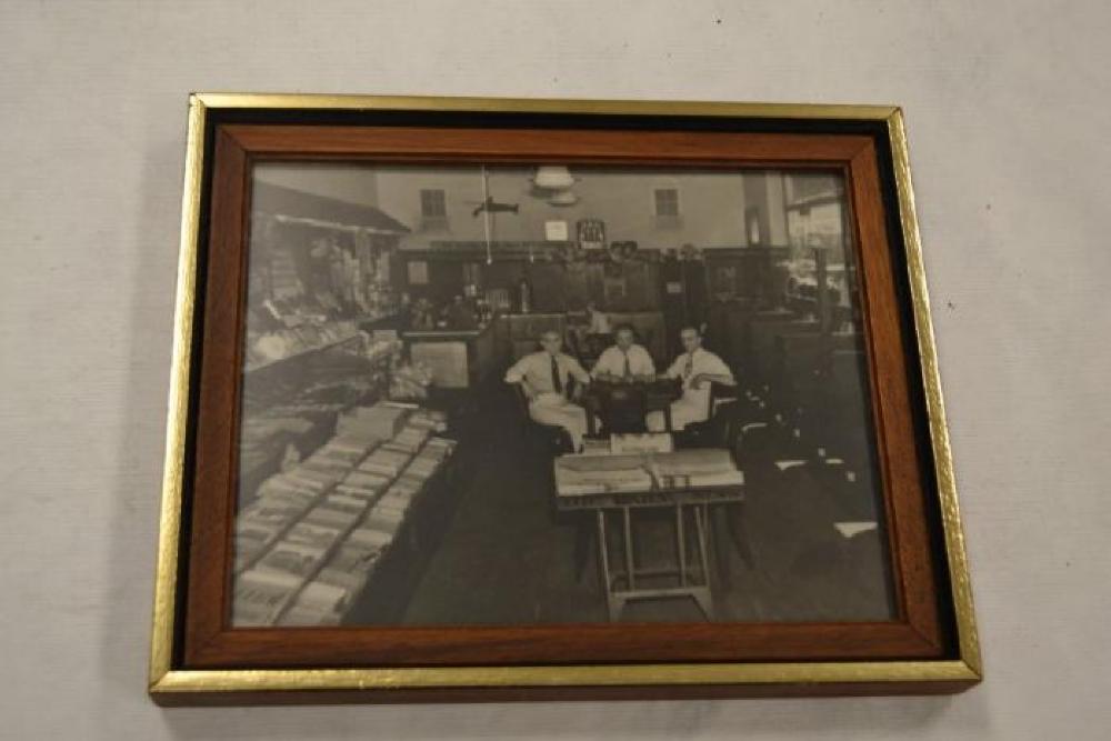This is a photograph of the interior of Alex's Candy Shop. The picture is black and white. The picture has Alex sitting at table in the center of the room with George on his left and Constantine on his right. There is also a customer sitting behind them at the counter. There is merchandise on the left side of the store and seating for customers along the windows on the right. There is a counter in the back.