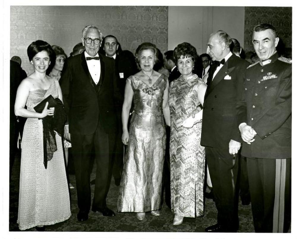 This black and white photograph shows Andrew Fasseas (second from the left) posing with a group of AHEPA members at an AHEPA event.