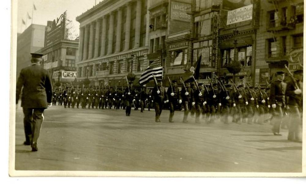 Photo of military men in uniform carrying guns in a parade. The parade is along Market Street in San Francisco.The bottom right of the photo is a little faded.