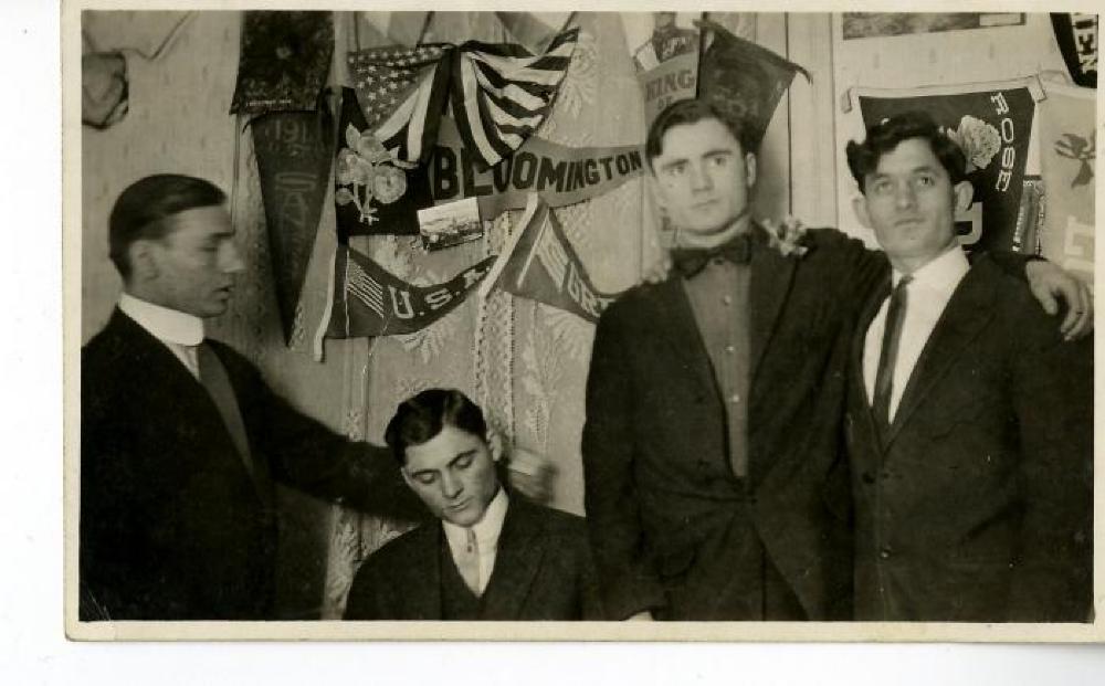 Four men posing in front of different pennants including USA, Bloomington, Greece, San Francisco, and a few more.