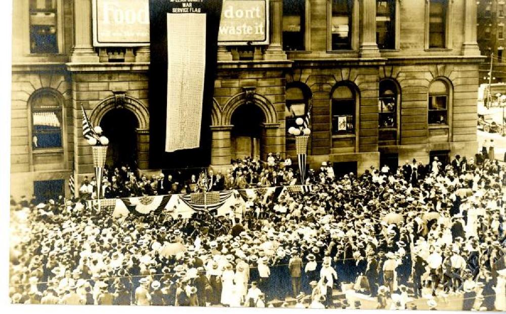 Sepia toned photograph of a crowd of people gathered at a building with a 'McLean County War Service Flag' flag hanging down the front. The people seem to be gathered for a speech.