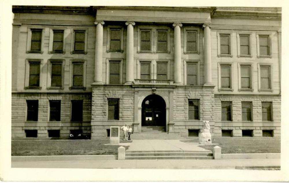 Two men walking in front of a building with four Ionic columns. There is a statue out front of the building.