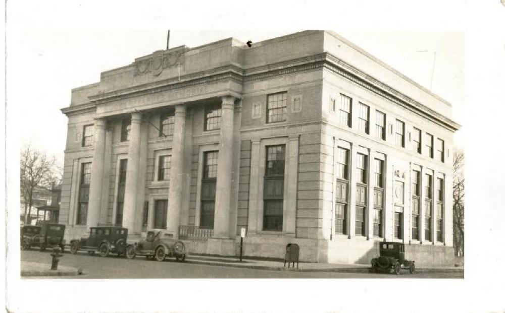 The John M. Barnes Memorial building with cars parked outside.