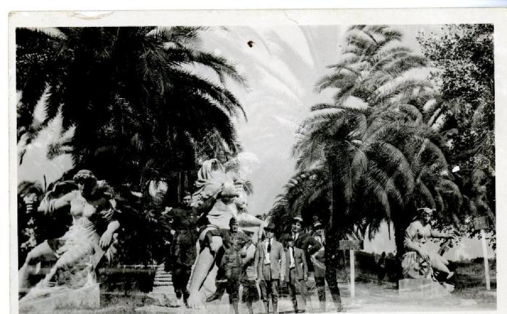 Four men posing with statues in a park or garden. There is a sign labeled 'One way drive' with an arrow pointing to the right. There are inconsistencies with the photo exposure makes it seem as if there are more than four men in the photo.