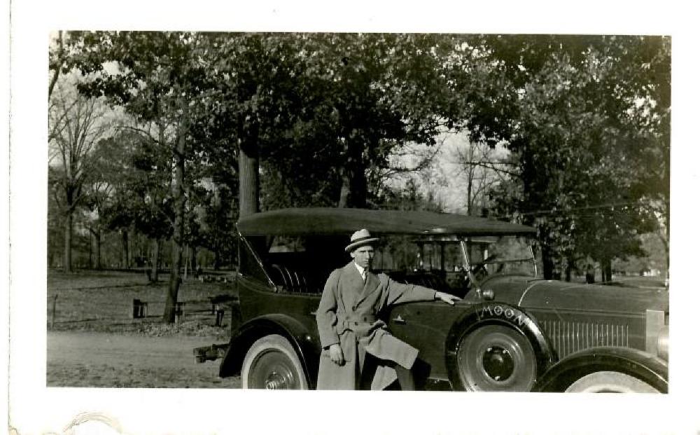 George Phillos posed in front of a 4-door car with an extra wheel on the side with 'moon' on it. There may be a gazebo in the background behind the car. It seems the picture was taken in a park.