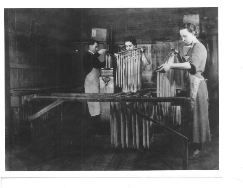 Black and white photograph of three people making candles. In the foreground two women hand long rows of candles on adrying rack. A man is in the processes of dipping candles in alrge vat, presumable of wax. They are in a large workroom with multiple long wooden frames for drying hundreds of candles at one time. The candles themselves appear to be very long and white.In the background boxes are piled on each other and there appears to be a collage of newspapers ont he back wall. Both women appear to be in their twenties while the man looks at leat ten years older. On the back a handwritten note identifies them as Evelyn Poulos, Niki Poulopoulos, and Peter Poulopoulos.