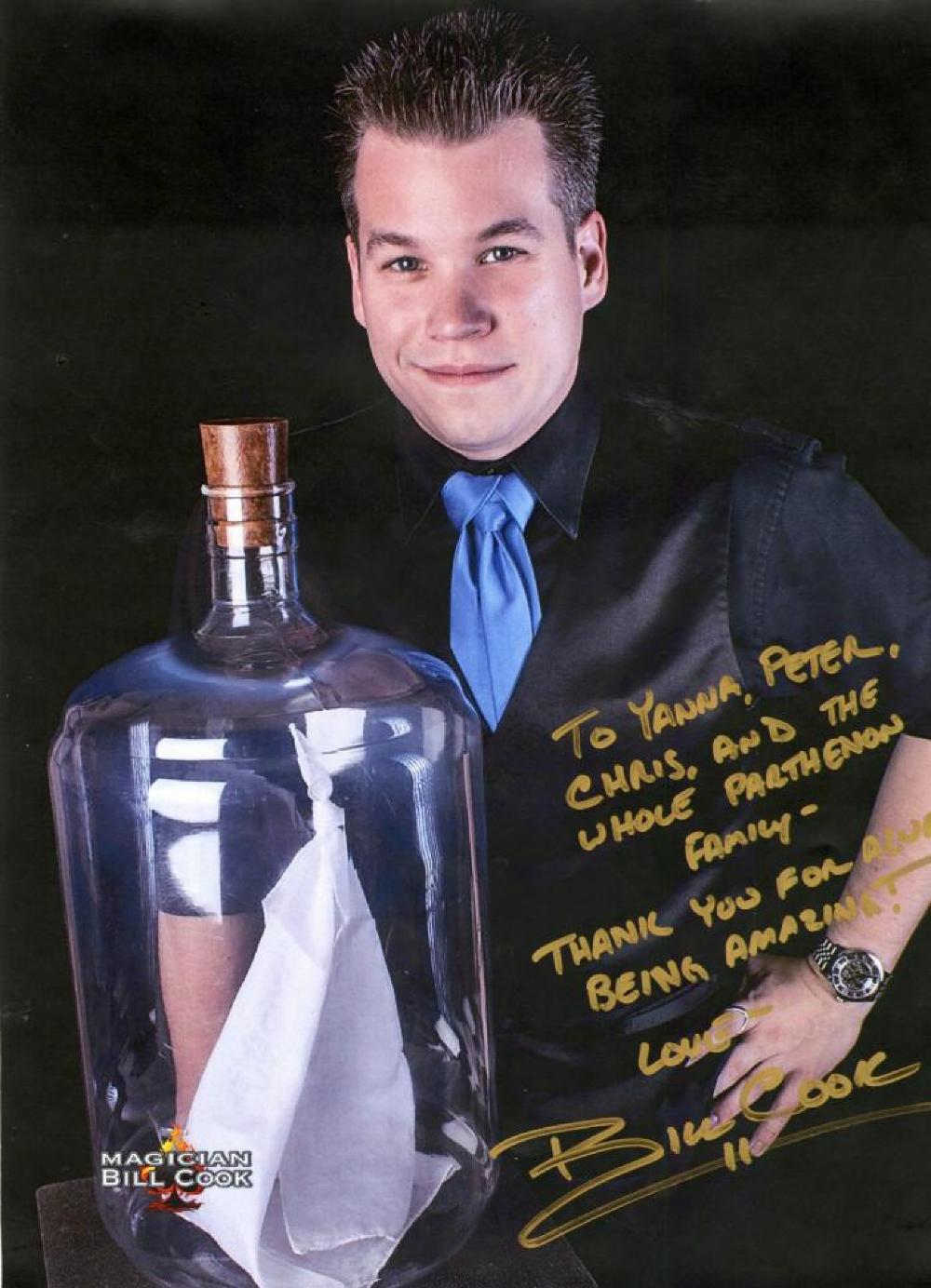 Photo of Magician Bill Cook signed for the Parthenon Restaurant. He is posed with a napkin in a bottle. Written on the photo in gold sharpie is "To Yanna, Peter, Chris, and the whole Parthenon family- Thank you for always being amazing! Love- Bill Cook"