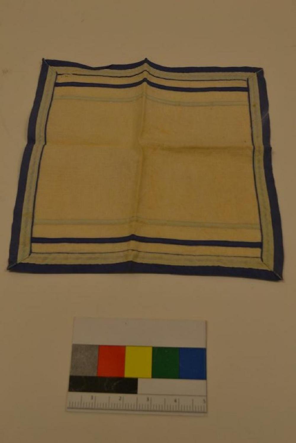 A cream colored linen napkin. The napkin is edged with dark blue fabric and light blue fabric within that. Within that border there are two stripes of dark blue and light blue within that. The napkin is slightly ripped in one corner and very stained with something that looks like faded tomato sauce.