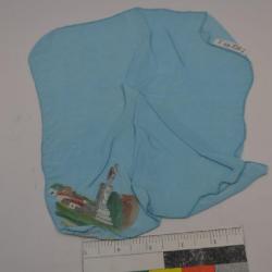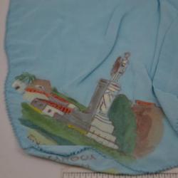 Blue, rayon handkerchief. Corner painted decoration, landscape with statue. Hand-painted corner. There are Greek letters at the bottom of the corner. The statue is in grey and is standing on a pedestal. There is a tree behind it. to the left, there are low white houses with orange roofs and red stripes, along with a tropical-looking tree.