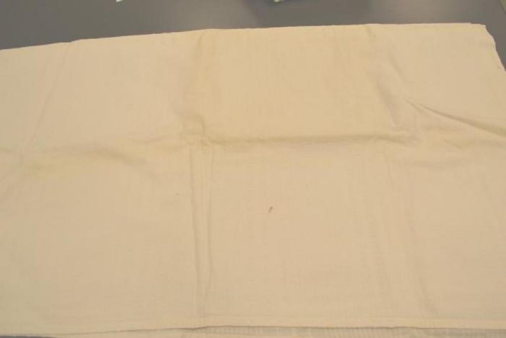 Twin bedspread made of cotton. Fabric is offwhite and has a seersucker pattern and very thin material. Seersucker pattern alternates between different levels of thickness in the stripes.