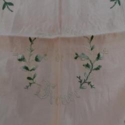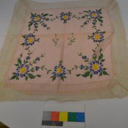 Pink tablecloth with blue, green, and yellow flowers embroidered in sateen cotton. Souvenir from France. The flowers are blue with a yellow center. In the middle, there are three smaller blue flowers branching off of a bigger one on green vines. These smaller flowers have green centers. There is one big flower with a yellow center in between each of the corner flowers, all connected by green vines with green leaves. The middle of the tablecloth has white stitching that reads "Souvenir of France." with green and white vines and leaves connecting the words "Souvenir" and "France" There is ecru lace edging around the edges.