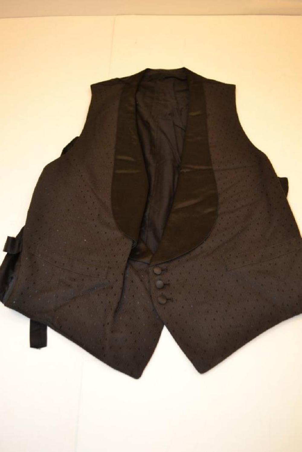 Black on black petit point patterned tuxedo vest with smooth rounded lapels and three-button closure. Matching black satin straps with buckles on each side to adjust width for better fit.