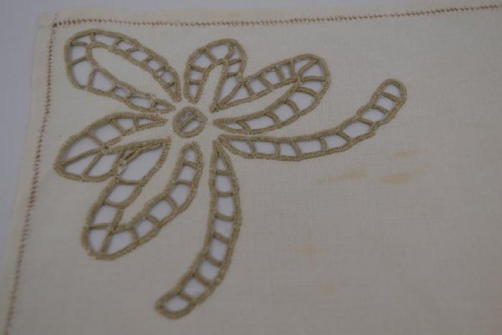 Square beige linen with tan cutwork . Floral design in corner. There is a small border of cutwork around the edge. The design in the corner consists of curved lines cut out in a shape that looks somewhat similar to a butterfly, with two antennas at the top, then two wings on each side with a circle in the middle, then a loop at the back. The curved lines have lines of thread going across them.