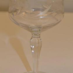 Small glass/crystal wine goblet. There is machine etching on the cylinder of the glass. The etching is a floral design.