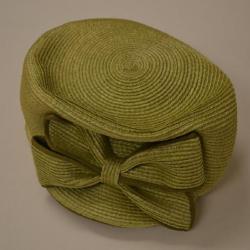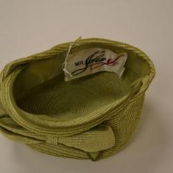Lady's lime green straw pill box hat. Size 23. Light green straw hat with large straw bow. Straw pattern spirals out from center top. Interior band and edges of brim and bow are lined with darker green ribbon. Large tag at back reads "Mr. John Jr." in black and red script. The stitching along the tag has come loose and it is only held on in 2 places. There are a few stray threads sticking out along the interior band. Hat is discolored in a few places along the band with a small dark spot in center of back. There is some yellow discoloring along interior band. Hat has somewhat lost its shape, especially along the right side, front and top where it folds in toward the center.