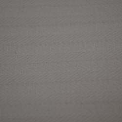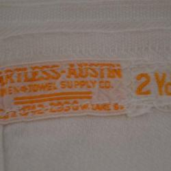 White tablecloth with horizontal white stripes. The stripes have a herringbone pattern repeated on them (a closely-spaced pattern of short diagonal raised lines). The tablecloth has a tag that reads "Hartless-Austin Linen and Towel Supply Co." and "2Yd" on a white tag with orange writing.