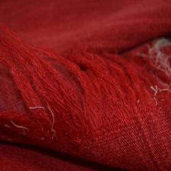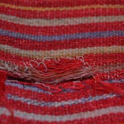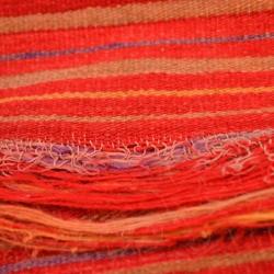 Handloomed wool and cotton bedspread (or wall hanging) in shades of red and multicolored stripes, though it is mostly red. The other stripes are at the top and the bottom. Colors of the stripes include blue, orange, beige, brown, and white.