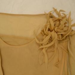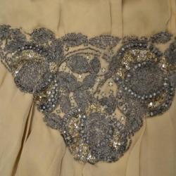 Long-sleeved, ecru silk wedding gown with large silver embroidered embellishment with subtle gray and white beads and a touch of silver sequins on the left hip area of the dress. There is a tuft of the same ecru fabric on the left shoulder that has the appearance of a silk chrysanthemum.