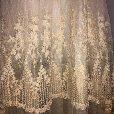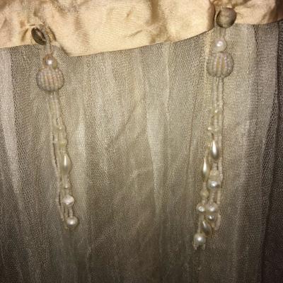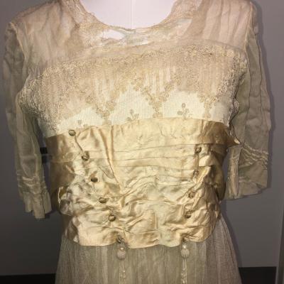 Wedding gown of lace, organdy, and silk. Pearl tassels at the waist, lace at the neckline.