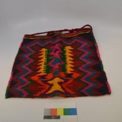 The outermost color of the tagari is dark blue. The pattern of zig-zags begins with the color red, followed by teal, then pink, then green. The zig-zag pattern runs up the left side, across the top and back down the opposite side. It continues to the other side of the tagari and runs around the outer edges in the same way it did on the first side. At the center of the bag, a geometric design runs down the center and continues to the other side. It consists of blocks or sections of brightly colored geometric patterns stacked on top of each other.