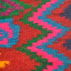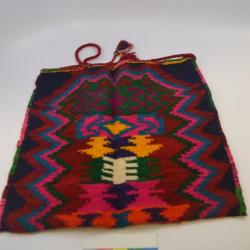 A tagari; a woolen multicolored handmade tote bag. The bag is rectangular and brightly colored with pink, maroon, and green stitching along the edges on all four sides. Each side of the tagari is different from the other, having a unique large geometric design running vertically down the center of the tote with complementary multi-colored zig-zag patterns starting out boldly in the center and growing darker as they reach the outer edges.