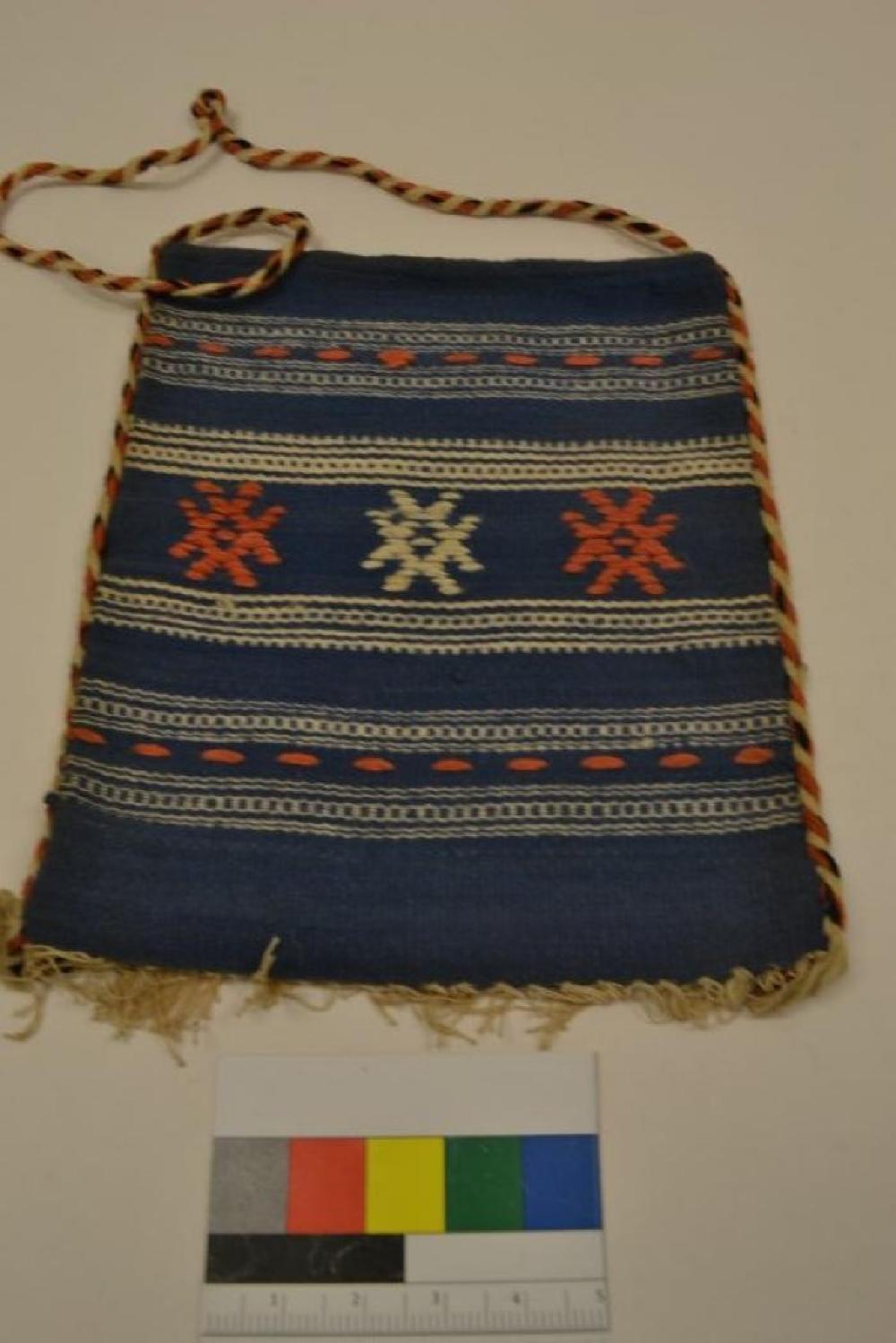 Woven, wool, handmade handbag (tagari). Blue background with white and coral stripes, dots, and snowflake designs. The rope straps are cream, black, and coral braided.
