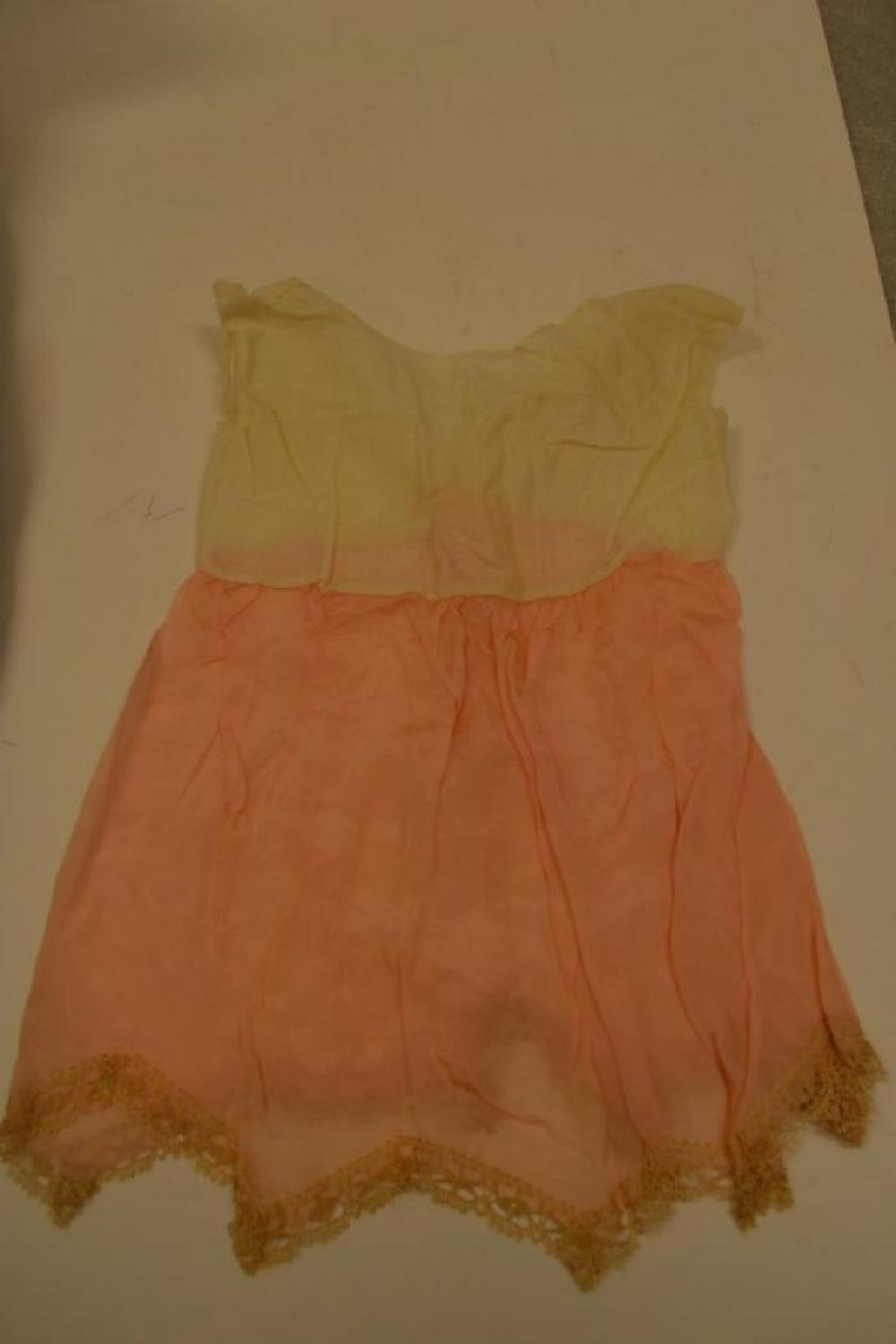 Baby's Christening Slip. Sleeveless slip with two buttons on the back. white blouse section, pink skirt section. button edge is uneven with goldish-colored trim.
