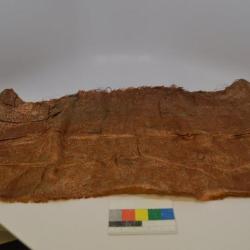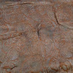 A rectangle piece of silk fabric. The fabric is gold-colored with a lighter gold embroidered floral pattern throughout. short ends have seams—severe creasing. There are black spots in the middle of the fabric and the long ends are frayed.