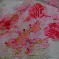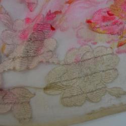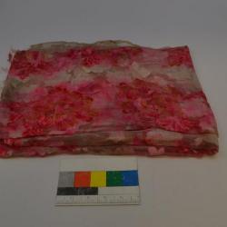 A sheer rectangle of cloth with a white embroidered flower pattern throughout. Both long sides have finished seams. There appears to be a design of a pink flower with red stripes and a circular center with greenish-yellow accents dyed over the cloth in a pattern.