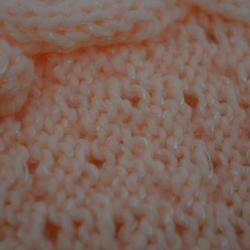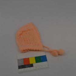 Pink hand-knitted baby hat. The yarn used has white strands in it as well. The hat has a pom pom on each drawstring, which goes through the back of the hat. The drawstrings were made of yarn knitted into a strand. The front edge of the hat is scalloped and all of the edges have been doubled over. The sides of the hat have holes in a gridlike pattern and were made with purl stitches facing outward. The middle of the hat was made with knitted stitches outward, and there were holes down the middle. On each side, there is a cable of stitches that sticks up and winds around, creating a design. There is a matching outfit that goes with the hat (2005.5.10).