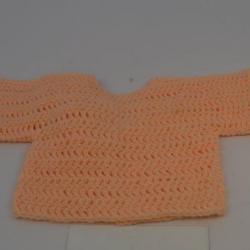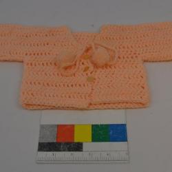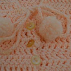 Pink crocheted baby jacket with puff balls and buttons on the front. The puff balls are on strings that tie in a bow in the front. The buttons of the jacket are yellow. The edges of the sleeves of the jacket are slightly scalloped. This is a part of a corresponding outfit (2005.5.10).