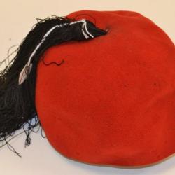 Dome shaped red fez. This unlined fez is constructed of plain red wool and has a thick black tassel attached to the very top. The letters "BY" are stitched by hand on the inside of the fez at the top where the tassel attaches.