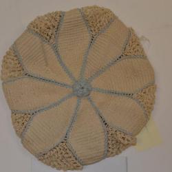 Ecru dust cap with scalloped blue trim. This crocheted cap is handmade with ecru thread giving it a lacy appearance. A tatting ecru flower resembles a large daisy and is overlay on top of the hat. The flower covers most of the cap except for the bottom inch or two. Its petals are edged in blue crocheted thread and it is topped with a blue button-like crocheted center. The cap is finished with scalloped baby blue crochet edge.