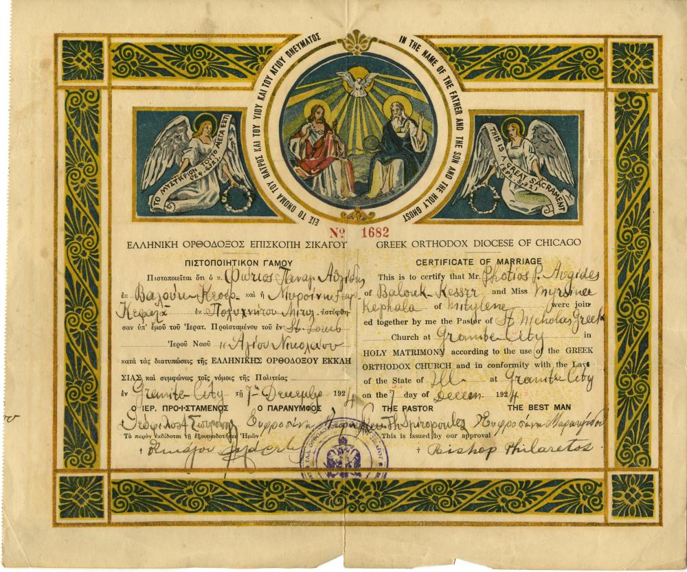 Certificate, Marriage, 1924, National Hellenic Museum, https://collections.nationalhellenicmuseum.org/Detail/objects/6644. Accessed 12/19/25.