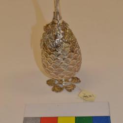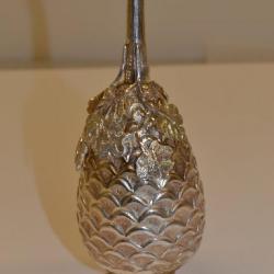 Silver cruet. The cruet is in the shap of an egg with a scale like design. The top and the foot have grape like leaf vines. The steam of the cruet is the spout.