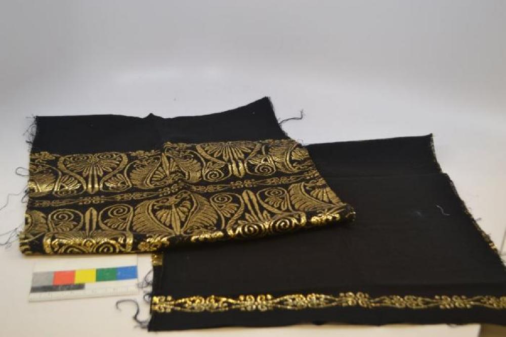 Two pieces of black heavy cloth with golden metallic thread that is a curved lyre-like design. The edges of the cloth are extremely frayed. In between the two curved lyre designs, there is a row of what looks like sideways hearts. The other half of the cloth is completely black., besides a small border of the sideways hearts at the bottom.