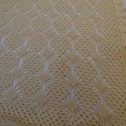 Crocheted tablecloth, cream rectangle. The table runner has a diamond design, where half of the diamonds are filled with a gridlike pattern, while the other half has a starburst-type pattern, with a solid diamond of thread in the middle surrounded by strings reaching for the edges. The diamonds that are alike are connected to each other by their points, while opposite diamonds are located in the space between four like diamonds. The edge of the cloth has a border of a gridlike design, surrounded by a trim that looks like three small shapes that are almost circles stacked on top of each other.