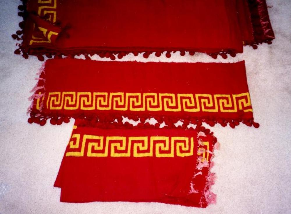 RED WOVEN DRAPES WITH GOLD KEY BORDER & RED TASSELS