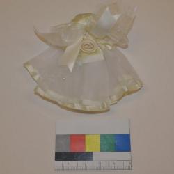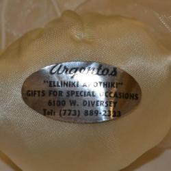 Boubounier. A wedding favor in a ecru color. The boubounier is made up of toule with satin bow and koufeta (candy tied in the middle). There is a silver sticker on top that says "argentos "Elliniki Apothike" gifts for special occasions 6100 W. Diversey Tel: (773)889-2333."