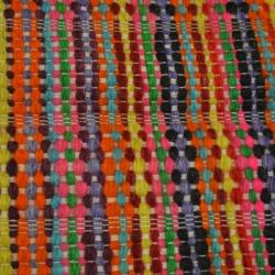 Multicolored, rectangular blanket that would be used over a donkey saddle. woven with wool. The colors used alternate in color with maroon, purple, orange, yellow, pink, green, red, and blue. The colors run horizontally over the blanket with white, thin string running vertically between.