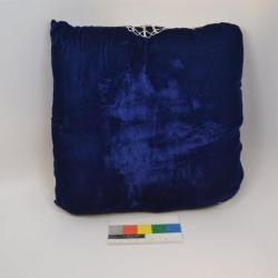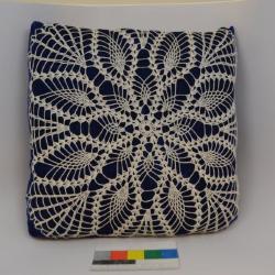 Decorative pillow with blue velvet fabric and white lace on top. This square pillow is made of an blue colored velvet. On the top, white lace lays over the the velvet. This crocheted lace has a has somewhat of a floral design. In the center is a circle, and radiating out of that are petal-like shapes. The lace has a scalloped edge. The center of the crocheted lace overlay is not exactly in the center of the pillow. On the back, there is only velvet and no lace. There are no apparent stains on the pillow. The corners are slightly folded in, not by design, but perhaps through years of use. On one of the corners, some clear string is poking out.