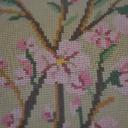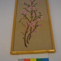 Framed embroidery, cross stitch multicolored floral design on beige background. It is meant to be hung vertically. The frame is golden colored, with red scuff marks along the bottom. The design consists of pink flowers with dark pink lines on a tan and brown stem with green leaves. One of the flowers has a yellow center.