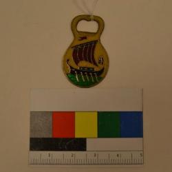 Brass bottle opener with the image of a galley. The galley is show sailing on a green sea. The ship hasa red sail, oars, a black hull, and a blue cabin and decoration on the stern. There is a red flag flying from the top of the mast. The ship is set against an off-white background.